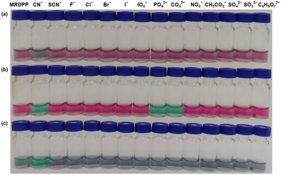 Visual response of MRDPP (25 μM, 1 eq.) upon addition of anions (1 mM, 40 eq.) in different solvents: (a) distilled water (+0.025% v/v of methanol); (b) acetonitrile; (c) ethanol.