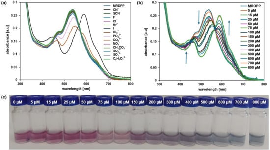 Spectroscopic measurements were carried out at 25 °C using transparent NUNC® 96-well plates. The absorption spectra were recorded at a final MRDPP concentration of 25 µM after an equilibration period of 10 min. Baseline corrections were applied using the respective solvents as a reference. Screening experiments were performed in distilled water and 20 mM HEPES buffer (pH 8). For the titration experiments, an initial MRDPP stock solution of 100 µM was prepared in methanol, while a cyanide aqueous solution was used at a concentration of 2500 µM. The titration curves were recorded and analyzed using Excel and Prism 5.0® version software [87,88].