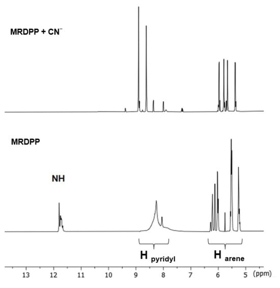 A possible explanation of the ratiometric changes in absorption is the intermolecular process involving the lactam NH protons of MRDPP and cyanide ions (Scheme 2). A transformation occurs from the initial complex, MRDPP, with four lactam NH protons, to the deprotonated form of the complex and release of HCN. Deprotonation can be considered as an electron transfer to the nitrogen atom, which increases the electron density and induces the delocalization of the electron throughout the DPP unit and thus leads to a more pronounced bathochromic shift [58,59]. The delocalization of electrons is facilitated by the internal electrostatic forces between the negatively charged nitrogen of DPP and the Ru(II) centers via the pyridyl groups (Figure S6). The proton transfer exhibits similar behavior to an intramolecular charge transfer, where in the absence of CN− in solution, the neutral amide is not considered as a donor. However, in the presence of CN−, the NH is deprotonated and the nitrogen atom acts as a donor, while the other components of MRDPP serve as acceptors. This delocalization of electrons explains the red-shift in the absorbance upon addition of CN−. To validate this assumption, 1H NMR of MRDPP was conducted in DMSO-d6 with and without cyanide (Figure 5). Upon addition of four equivalents of CN−, the NH signal (∼11.7 ppm) disappeared completely. Moreover, the release of HCN from the DMSO solution can be demonstrated by placing a pH-indicator strip on top of the bottle, which reacts with acidic HCN vapors (Figure S7), thus further confirming the proposed sensing mechanism.