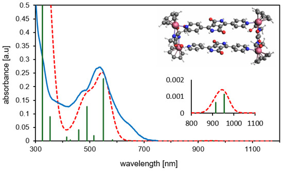 Experimental (blue) vs. theoretical (TD-DFT/PBE0, dashed red) UV-vis spectra for syn-MRDPP. The green vertical bars represent the oscillator strengths for the main absorptions. Inset: expansion of the less intense band appearing at about 950 nm.