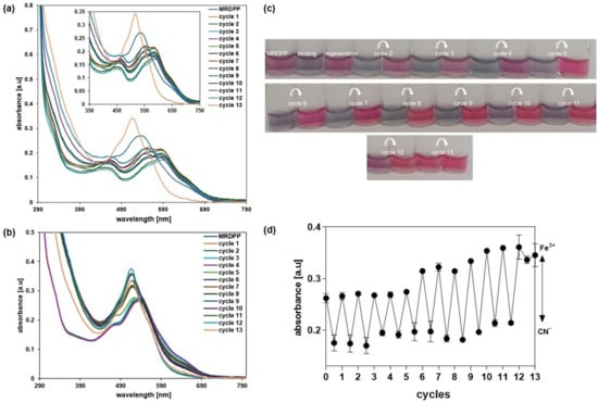 Multiple cycles were carried out in distilled water with 0.025% (v/v) methanol, alternating cyanide and FeCl3 solutions. A solution of CN− (400 µM) was added to a solution of MRDPP (25 µM); when saturation was reached (about a 30.8% decrease in the absorbance at 540 nm), a 68 µM solution of Fe3+ was added, resulting in an increase in the absorbance, showing that the complex formed between Fe3+ and CN− was more stable than the [MRDPP]4+·(CN−)4 adduct. A second addition of CN− resulted, again, in a loss of 30.7% of the absorbance intensity, which was recovered after the addition of FeCl3. Twelve cycles were performed, and the ratio between the MRDPP absorbance before and after the addition of the CN− solution was always around 30% (Figure 7). The [Fe(CN)6]3− complex is yellow, showing an absorbance around 440 nm (Figure S16). After cycle 6, the concentration of [Fe(CN)6]3− increases, which causes a blue-shift in the absorbance of regenerated MRDPP and gives a brighter color (Figure 7c). Interestingly, this change in the absorbance did not affect the visual detection of cyanide. After the last cycle, MRDPP was isolated by precipitation and ESI-MS spectrometry revealed a peak at m/z 467.59 corresponding to the intact sensor [MRDPP]4+ (Figure S17).