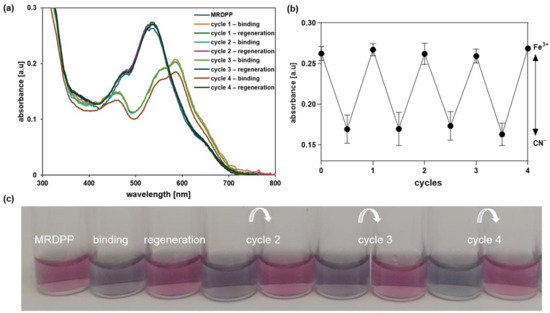 The regeneration experiments were conducted in a 100 µL well with a 25 µM MRDPP solution and 400 µM CN− (16 equivalents), corresponding to a signal close to saturation. To this mixture, 68 µM of Fe3+ (2.7 equivalents) was added. The mixture was left to stand for 10 min before recording the absorbance. The regeneration was carried out both in situ and ex situ. In the in situ experiment, the sensor was regenerated by precipitation at the end of all cycles. In the ex situ experiment, the sensor was precipitated at the end of each cycle.