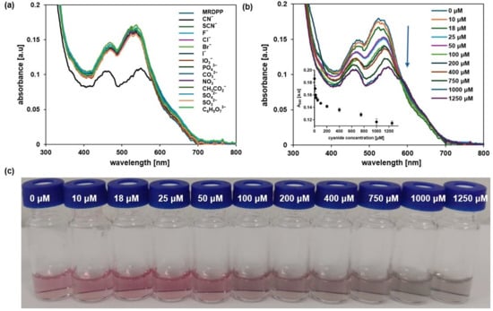where Aobs is the observed absorbance at a given concentration of cyanide, A0 is the absorbance of the free MRDPP, A∞ is the absorbance at saturation, K is the binding constant and [CN−]T is the total concentration of cyanide [90]. Titrations for the determination of the binding constants were performed in triplicate, and the average value was reported.