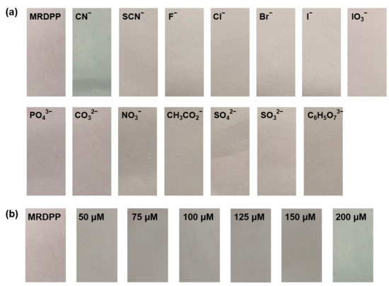 (a) Visual response of MRDPP (25 μM)-based test strips towards various anions (1 mM) in HEPES buffer (pH 8). (b) Test strips of MRDPP with increasing cyanide concentrations.
