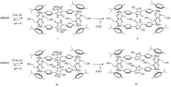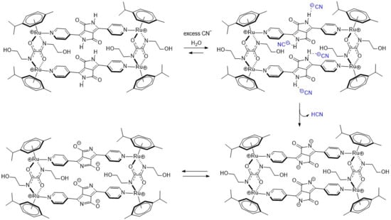 In distilled water, cyanide is partially hydrolyzed and an equilibrium between CN− and HCN is at play, which overall reduces the nucleophilicity of cyanide. On the other hand, under slightly basic conditions (HEPES buffer (pH 8)), this equilibrium mostly shifts toward the CN− form, thus increasing CN− nucleophilicity towards electrophiles and accordingly switching the target from the NH protons of DPP to the adjacent carbonyl groups. Such reactions of electrophilic carbonyl compounds with CN− are known in the literature [72], particularly with electron-deficient amides [73]. Based on this fact and facilitated by the presence of an electron-deficient DPP backbone and a positively charged Ru-based assembly, the electrophilic carbonyl carbon atoms in DPP undergo 1,2-nucleophilic additions with cyanides, resulting in the formation of cyanide adducts (Scheme 3). Under basic conditions, intermediates I and III are unable to protonate and form stable species, so a rearrangement occurs after the loss of OH−, generating new assemblies (Forms II and IV, Scheme 3). The driving force of this rearrangement is the generation of more energetically stable systems by extensive conjugation through the bipyridyl–DPP spacers. This pathway of cyanide sensing by MRDPP was confirmed by ESI-MS spectrometry, where at four equivalents of CN−, a peak at m/z 472.58 was observed, indicating the addition of two CN− groups to the system [MRDPP + 2 CN – 2 OH]4+ (Figure S18b). Upon increasing the amount of CN− to 25 equivalents, a new peak at m/z 477.60 was detected, corresponding to the formation of the proposed form, IV [MRDPP + 4 CN – 4 OH]4+, with four cyanide groups replacing the four oxygen atoms of DPP (Figure S18c). Therefore, by modifying the pH of the aqueous medium, we were able to modulate the cyanide sensing mechanism of MRDPP. Under such conditions, the detection limit of MRDPP towards CN− was estimated to be 55.3 μM (Figure S19). The infrared spectra of MRDPP before and after the addition of cyanides were measured (Figure S20), showing the appearance of typical nitrile bands at 2240 and 2370 cm−1.