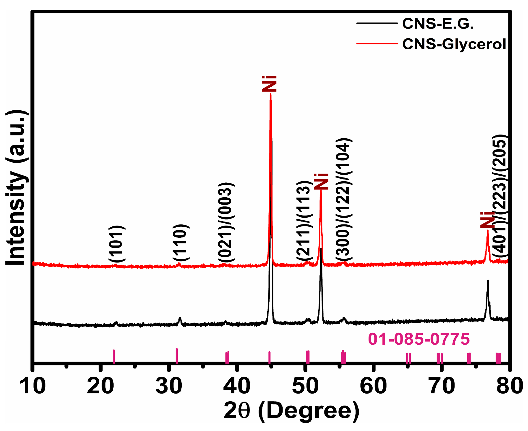 2 samples were labeled NS-E.G. and NS-Glycerol, respectively. While the diffraction signals from the Ni foam substrate are predominant, distinct and relatively intense peaks attributed to Ni