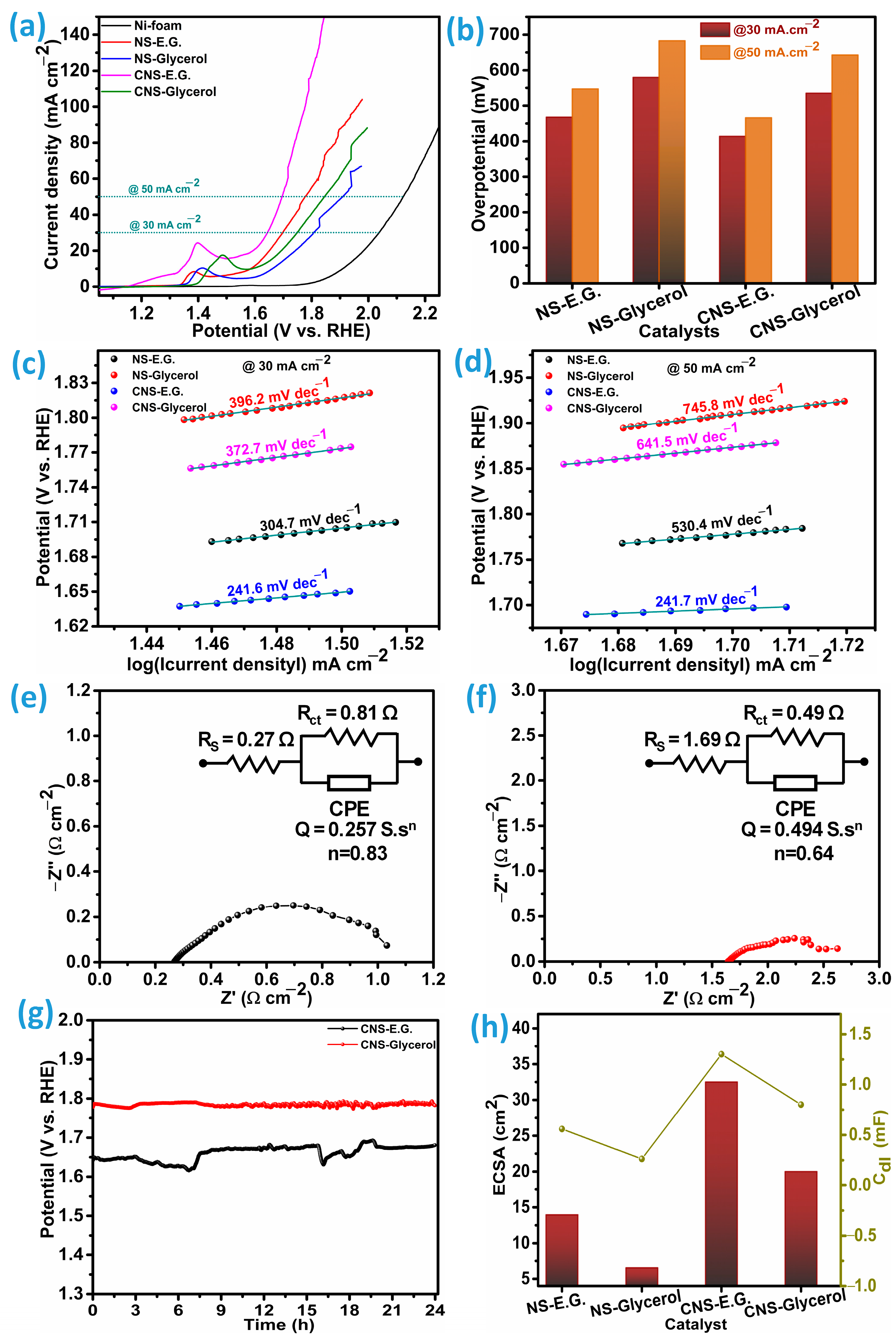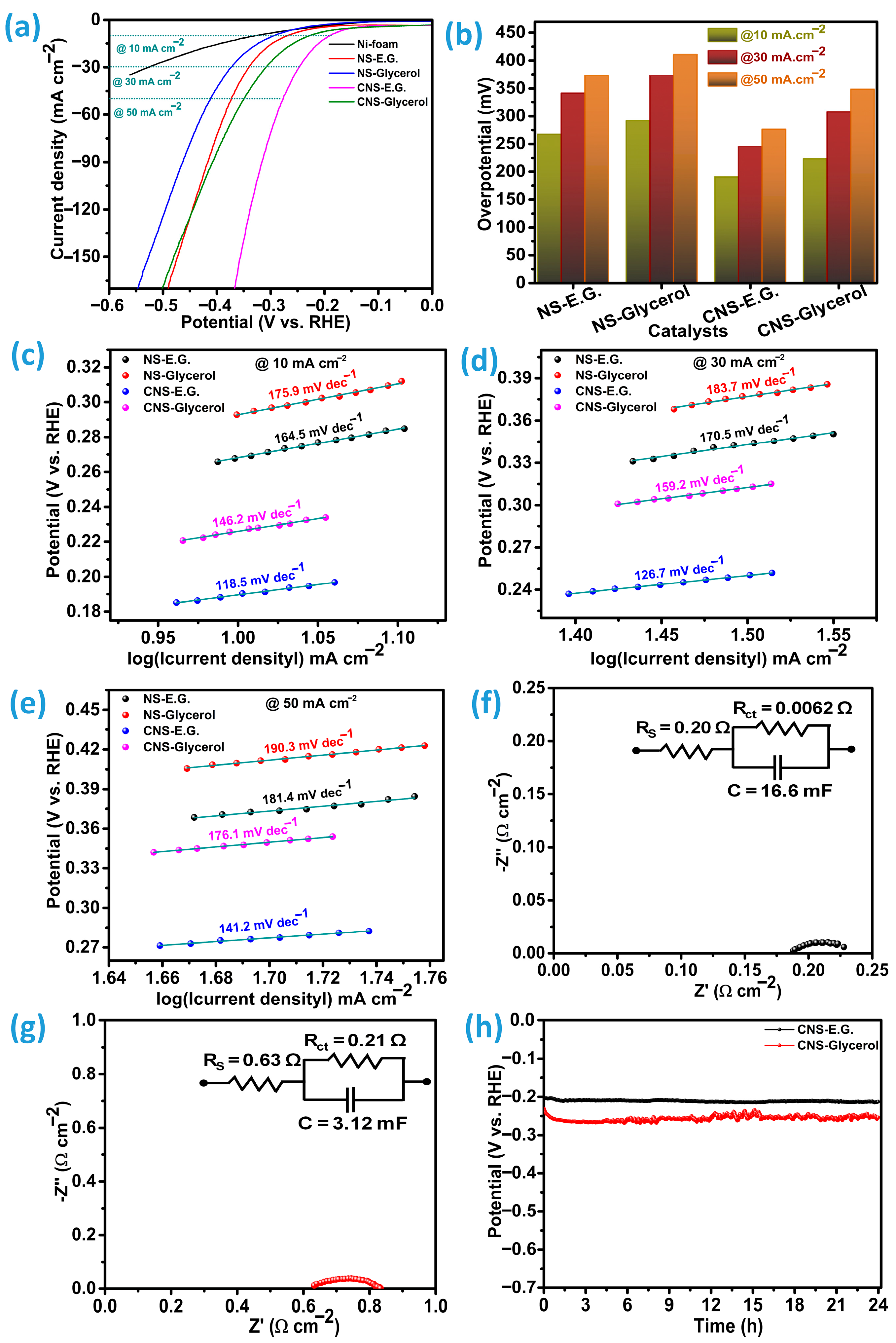 −1. The NS-E.G. catalyst also performed better than CNS-Glycerol, recording 304.7 and 530.4 mV dec