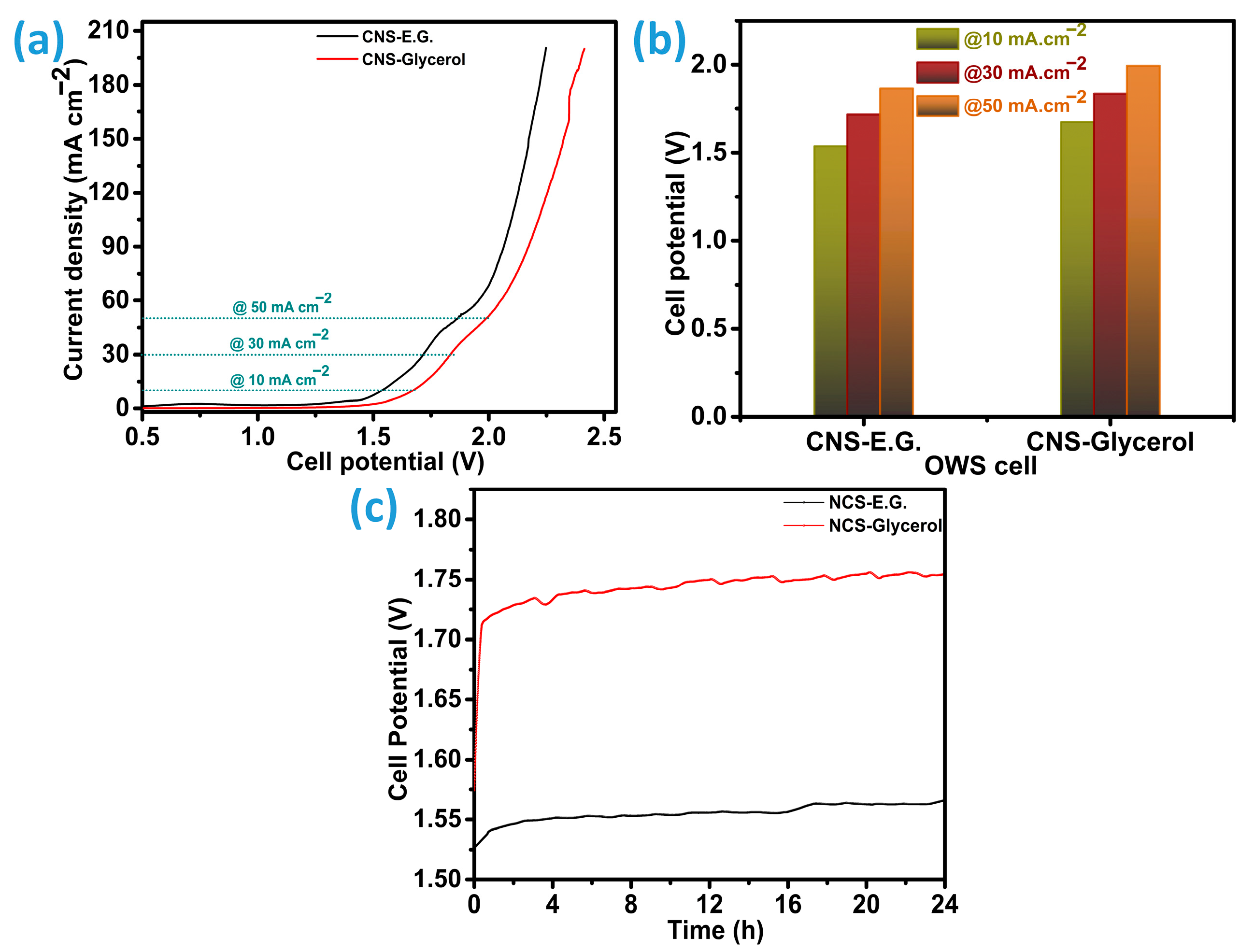 −2 at 1.866 V. Under identical conditions, the CNS-Glycerol system required 1.837 V and 1.994 V to reach 30 and 50 mA cm
