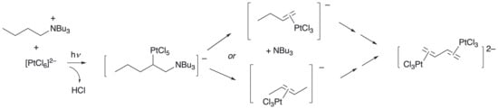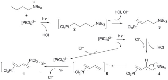 To probe the scope and hence mechanism of this reaction further, complementary experiments were identified that would provide additional support and insight, and it is these that form the basis of this paper. First, revisiting the mechanism (Figure 1) proposed originally, the photochemically driven formation of the σ-alkyl complex 2 is uncontentious, being based upon the extensive work of Shilov and Shul’pin [4,5,6,7,8,9,10,11,12], and β-hydrogen elimination from this complex to form 3 would be anticipated. Complex 3 then undergoes hydrogen abstraction followed by Hofmann elimination [7] to extrude the monoplatinum η2-butadiene complex 5, which then complexes with PtII to give 1. Both the formation of the σ-alkyl complex and the generation of Cl• occur via photoexcitation that generates PtIII and leads ultimately to PtII.