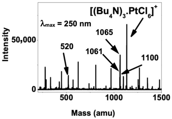 The UV photodepletion spectrum of [Bu4N]3[PtCl6]+ ion (λ = 250 nm) showing signals at m/z 520 = [(Bu4N)2Cl]+, 1061 = [(Bu4N)2Cl[(Bu3N)(C4H7)PtIICl3]]+, 1065 = [(Bu4N)3PtIICl4]+ and 1100 = [(Bu4N)3PtIIICl5]+.