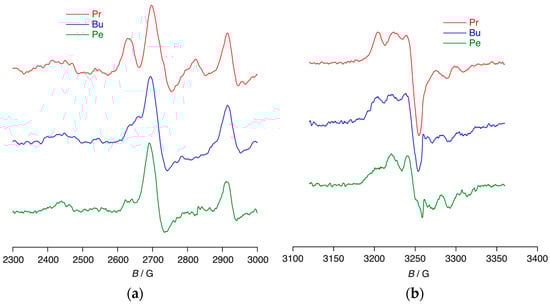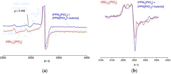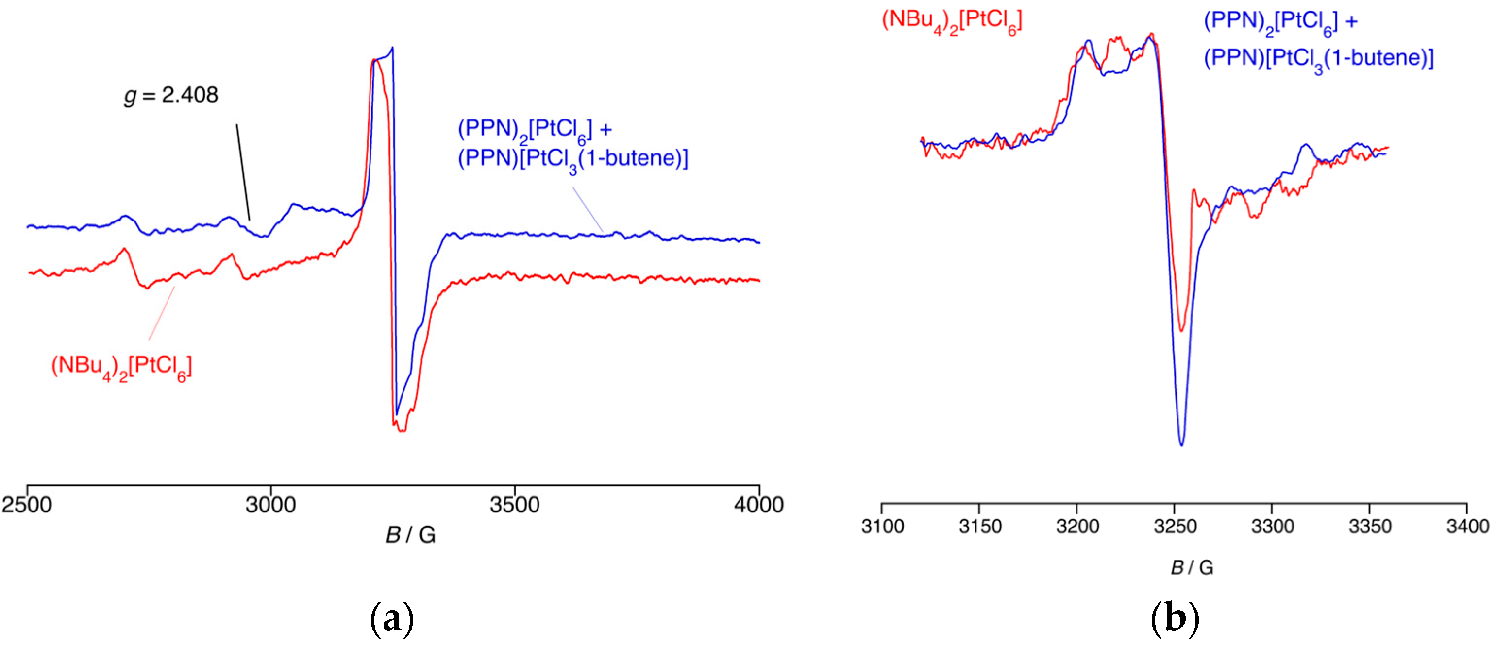 The in situ EPR spectra of [Pr4N]2[PtCl6], [Bu4N]2[PtCl6], and [Pe4N]2[PtCl6] recorded in dichloromethane at 120 K, showing (a) platinum(III) radical and (b) organic N-based radical.