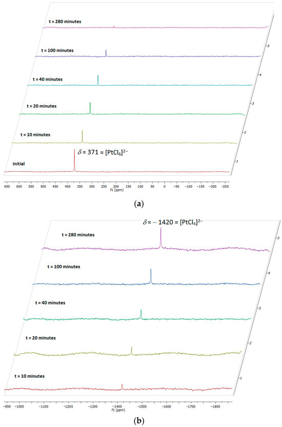 Evolution of the 195Pt resonance from (a) [PtCl6]2− and (b) [PtCl4]2− on irradiation of [Bu4N]2[PtCl6] in acetone.