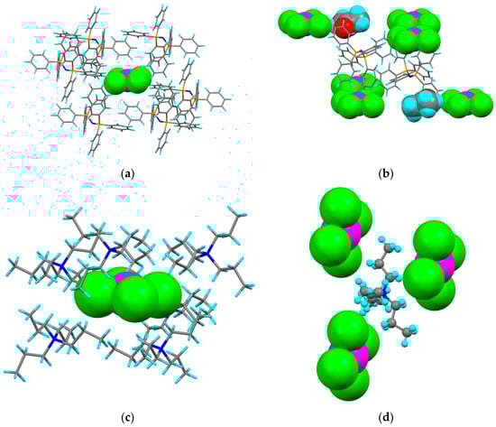 Structure of: [PPN]2[PtCl4] showing (a) a [PtCl4]2− anion in a pocket of [PPN]+ cations and (b) two [PPN]+ cations in a pocket of [PtCl4]2− anions (showing acetone of solvation) and of [Pr4N]2[PtCl4] showing (c) a [PtCl4]2− anion in a pocket of [Pr4N]+ cations and (d) a [Pr4N]+ cation in a pocket of [PtCl4]2− anions.