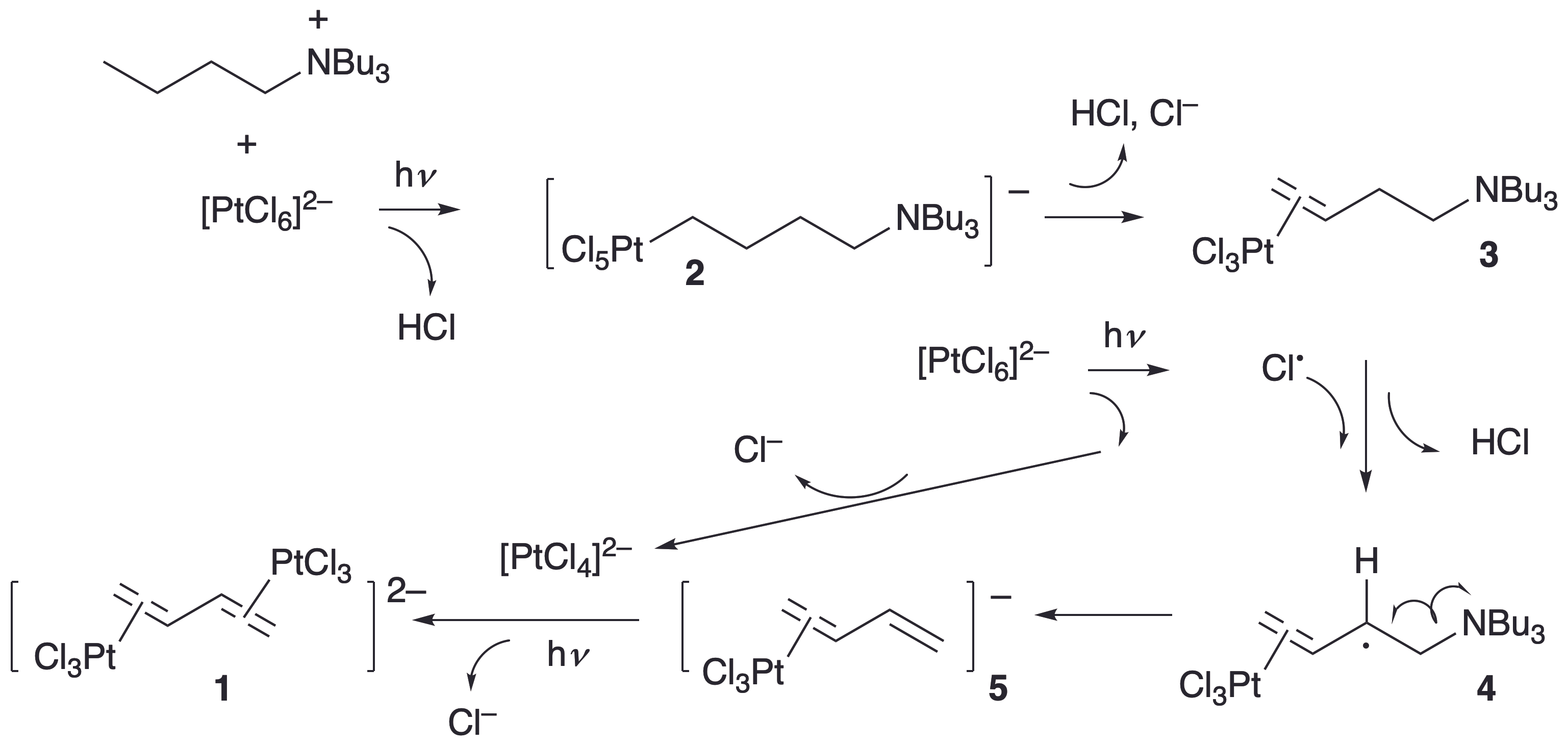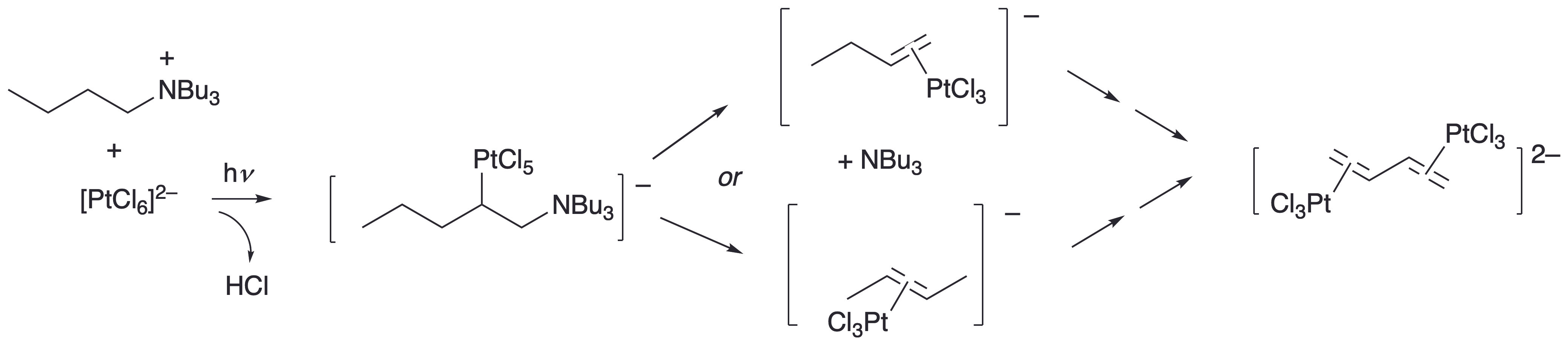 One of the key ideas in the proposed mechanism is that the butyl fragment is functionalised in two steps and that in both of these it remains attached to a Bu3N fragment—i.e., the formation of complex 2 and then 3, and also the formation and reaction of complex 4 (Figure 3). This pathway assumes that the initial C–H activation of Bu4N+ occurs at a terminal carbon, leaving the modified Bu4N+ with four C–N bonds. However, activation at a carbon closer to the nitrogen could conceivably have led to elimination of the alkene through the breaking of a C–N bond and the formation of [PtCl3(η2-butene)]−. If this were the case, then further reaction would require activation of [PtCl3(η2-butene)]− by [PtCl6]2− in a second photochemical step to generate the product. So, depending on the way the elimination occurred, either [PtCl3(η2-1-butene)]− or [PtCl3(η2-2-butene)]− could be formed.