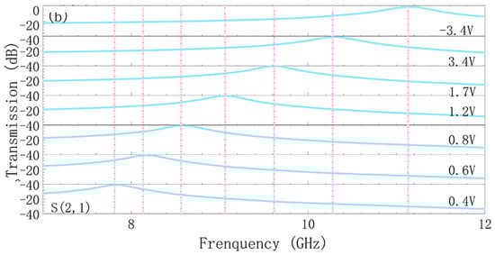 The insertion loss across the tunable frequency range was found to remain below −1.8 dB, even as the central frequency shifted from 7.8 GHz to 11.2 GHz under a DC bias sweep of 0 V to 4 V in 1 V increments. This corresponds to a tuning ratio of: