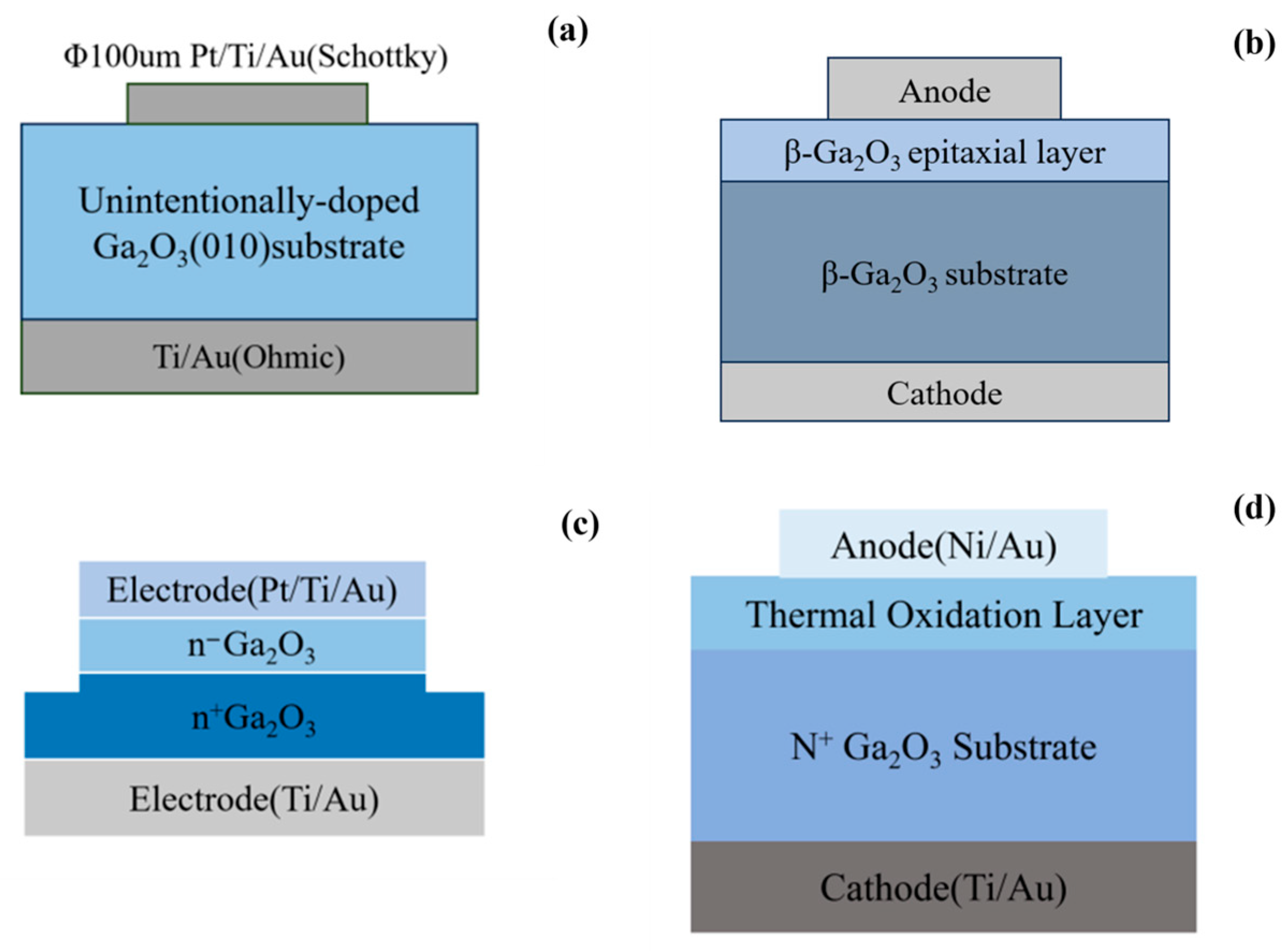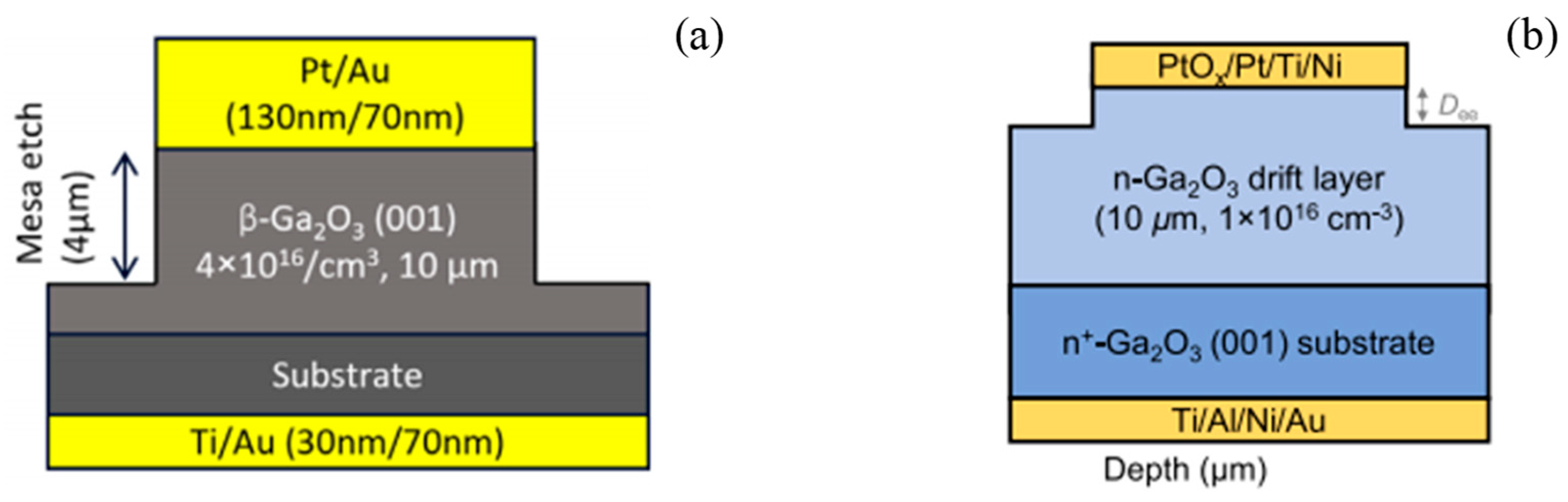 - Taboada Vasquez, J.M.; Li, X. A Review of Vertical Ga2O3 Diodes: From Fabrication to Performance Optimization and Future Outlooks. Phys. Status Solidi B 2025, 262, 2400635. [Google Scholar] [CrossRef]
