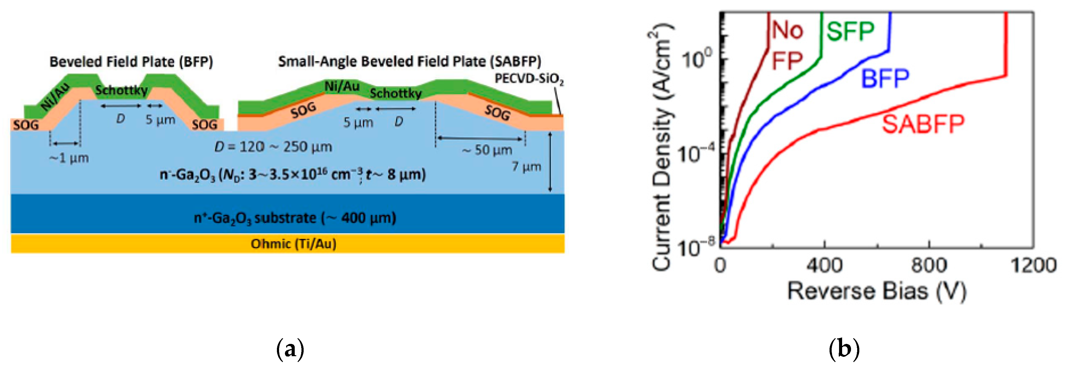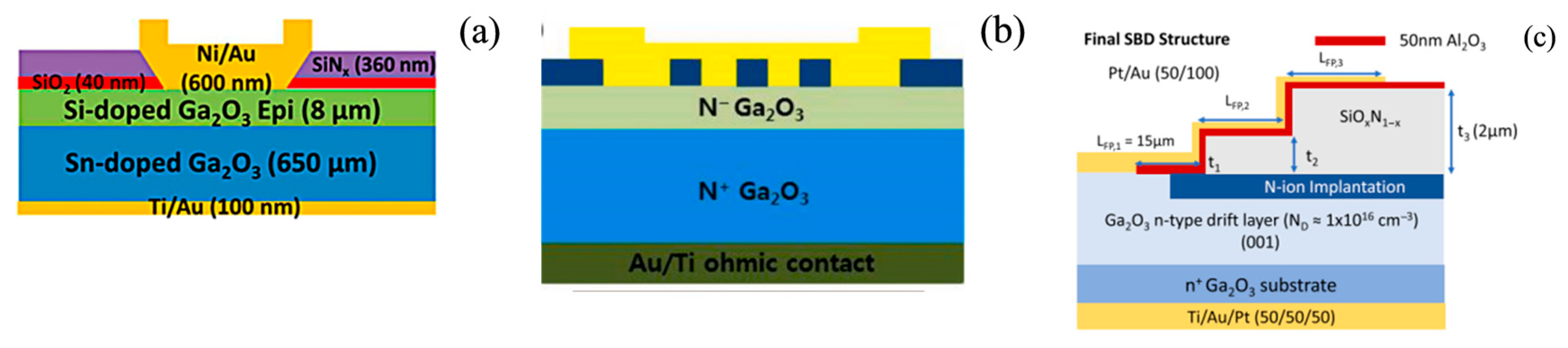 - Ji, X.Q.; Yue, J.Y.; Wang, J.J.; Zheng, H.C.; Li, S.; Liu, Z.; Shu, L.; Tang, W.H.; Li, P.G. Edge-Field-Suppression for Improved Breakdown and Leakage in Vertical β-Ga2O3 Schottky Barrier Diode Through Trench Field Limiting Rings. IEEE Trans. Electron Devices 2024, 71, 7696–7701. [Google Scholar] [CrossRef]