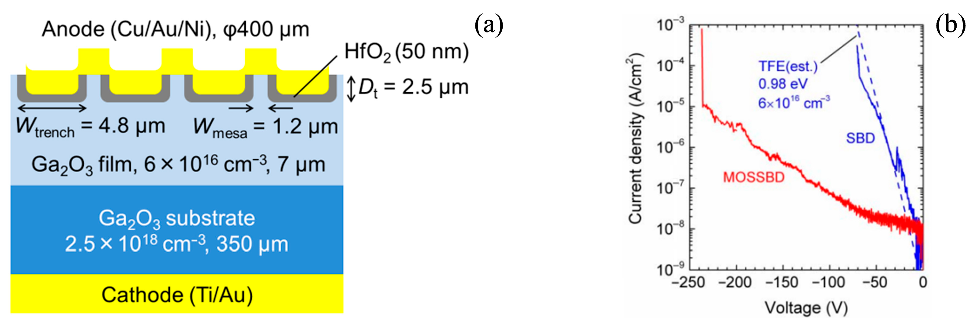 - Yi, B.; Xia, J.; Qiao, Y.; Zhang, Z.; Zhang, B.; Yu, G.; Qian, L.; Cheng, J.; Huang, H.; Kong, M.; et al. 1380 V β-Ga2O3 trench MIS-type Schottky barrier diode with ultra-low leakage current. Jpn. J. Appl. Phys. 2025, 64, 030906. [Google Scholar] [CrossRef]