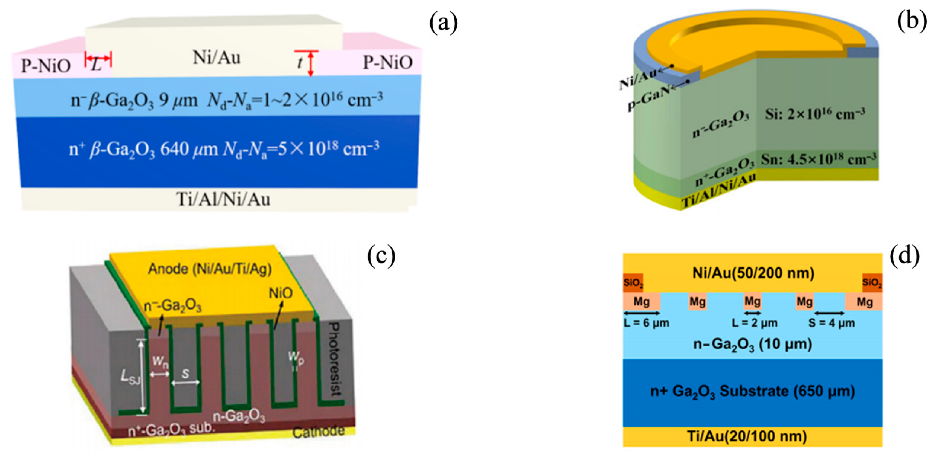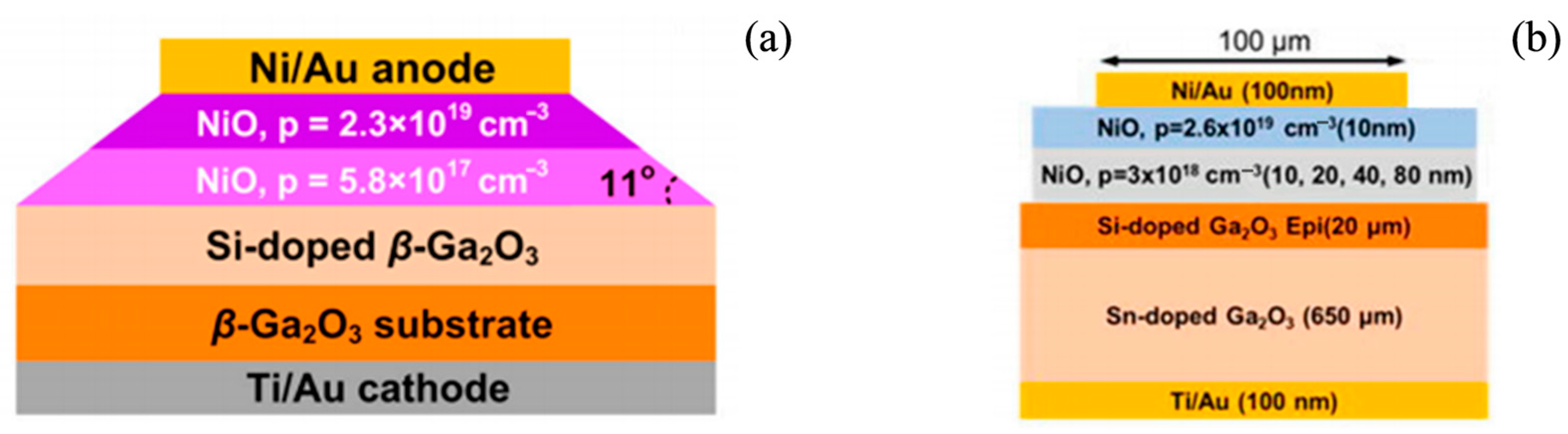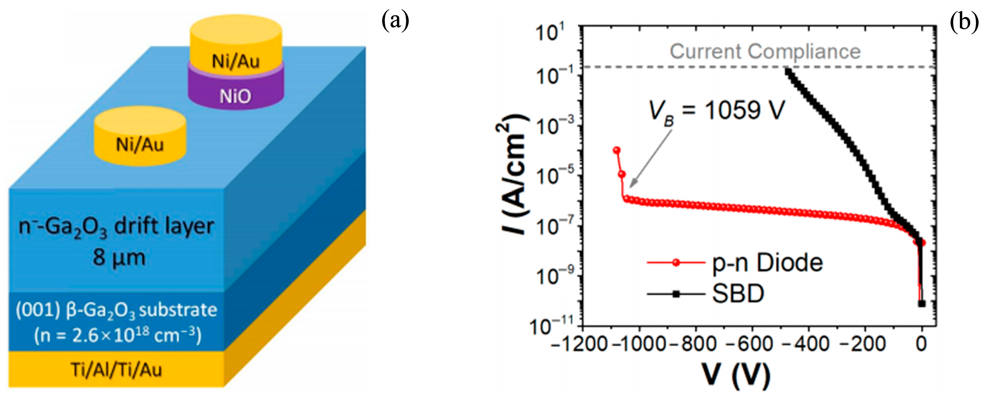 - Wan, J.; Wang, H.; Cheng, H.; Wang, C.; Que, Q.; Li, Y.; Zhang, C.; Sun, J.; Liu, D.; Sheng, K. 2kV Low Leakage Vertical NiO/β-Ga2O3 Hetero-Junction Diode and its Thermal/Electrical Stability. In Proceedings of the 2024 36th International Symposium on Power Semiconductor Devices and ICs (ISPSD), Bremen, Germany, 2–6 June 2024; pp. 200–203. [Google Scholar]