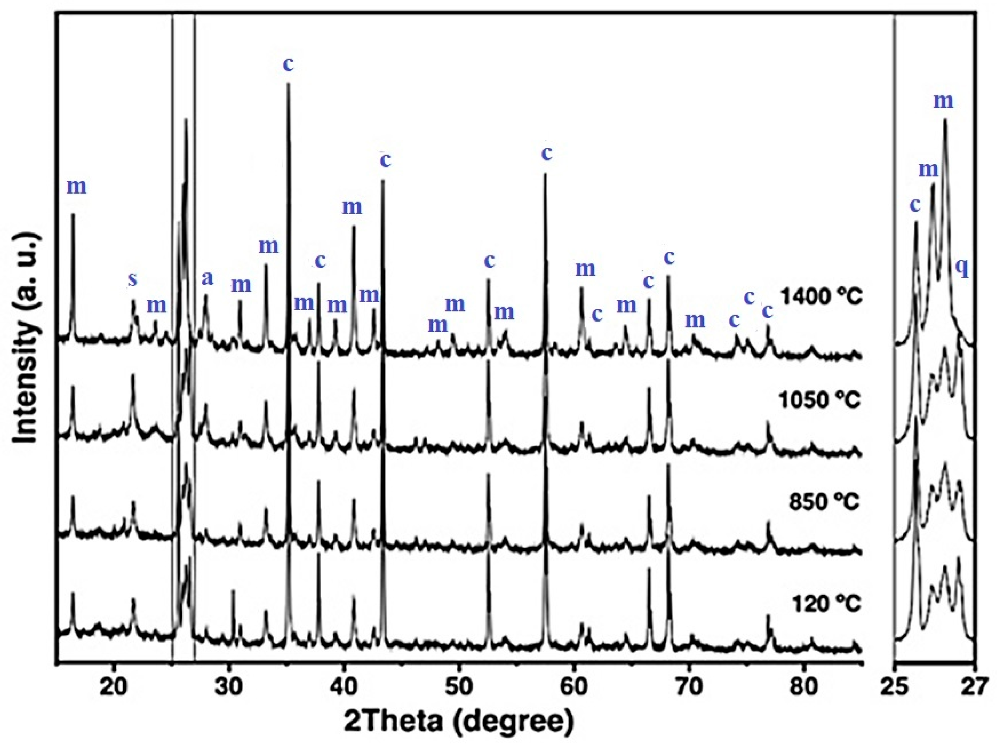 Figure 4. X-ray diffraction patterns of the CC refractory specimen obtained at different temperatures, where m = mullite, c = corundum, s = cristobalite, q = quartz, and a = anorthite.
