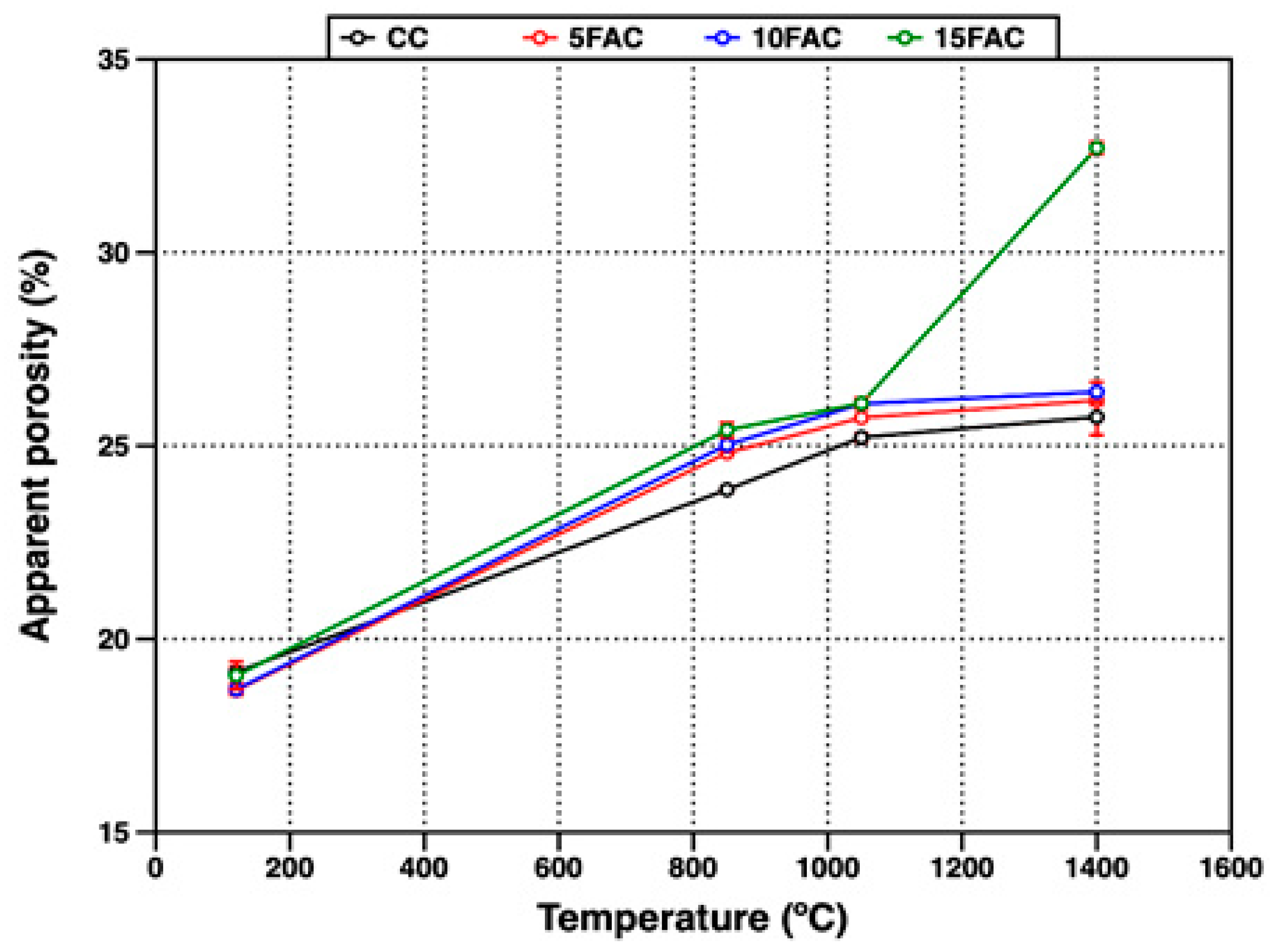 Figure 9. Apparent porosity of refractory specimens at different temperatures.