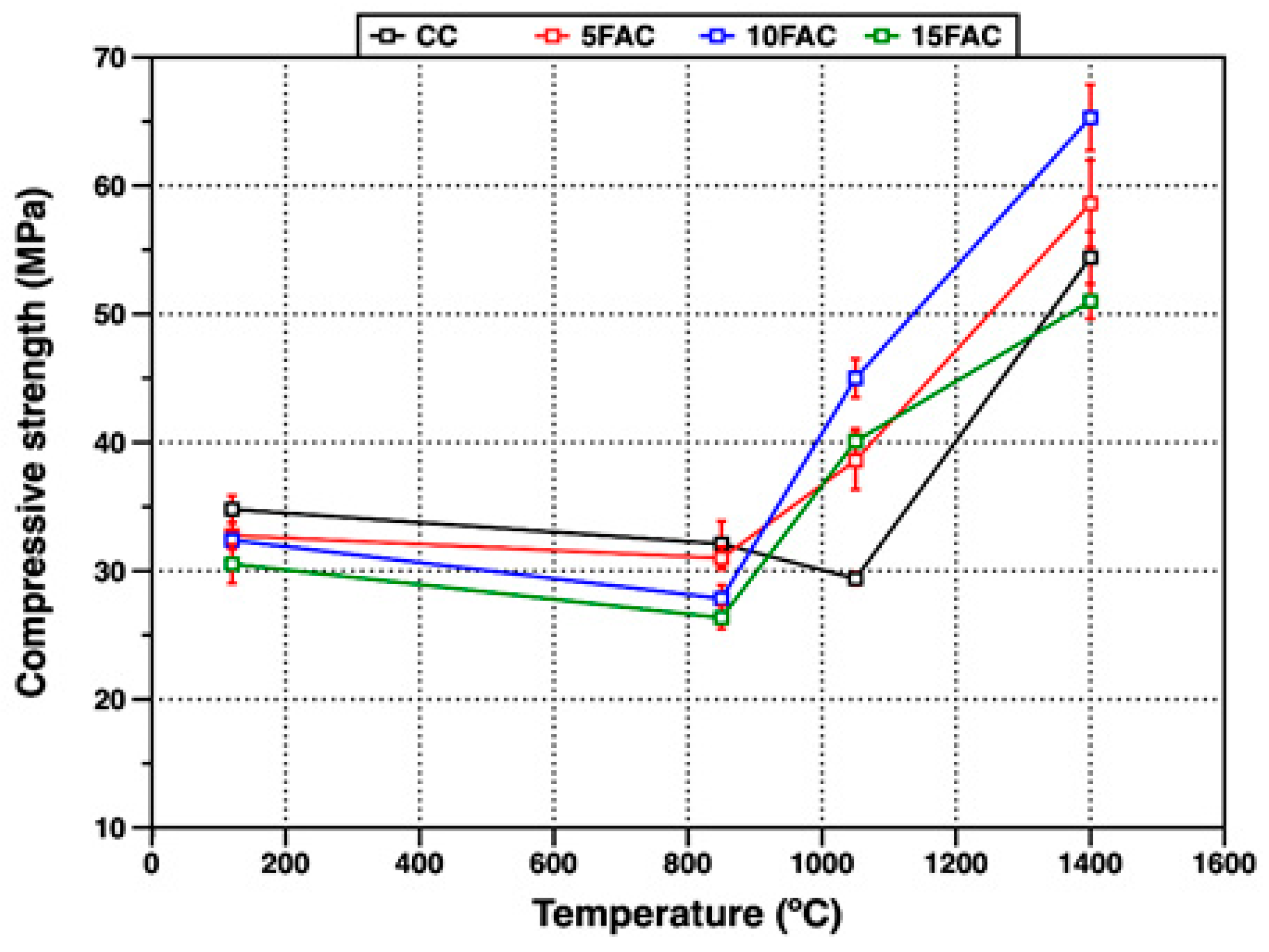 Figure 11. Compressive strength of refractory specimens at different temperatures.