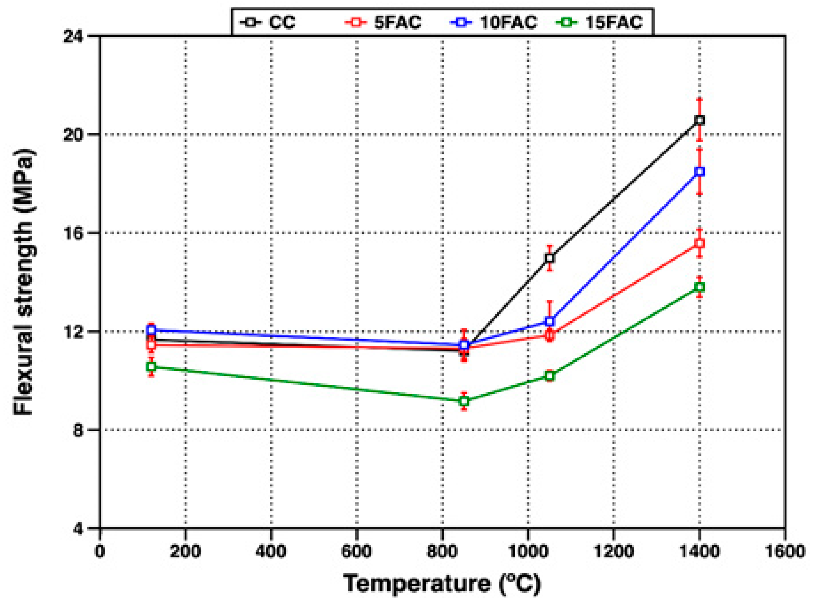 Figure 12. Flexural strength of refractory specimens at different temperatures.
