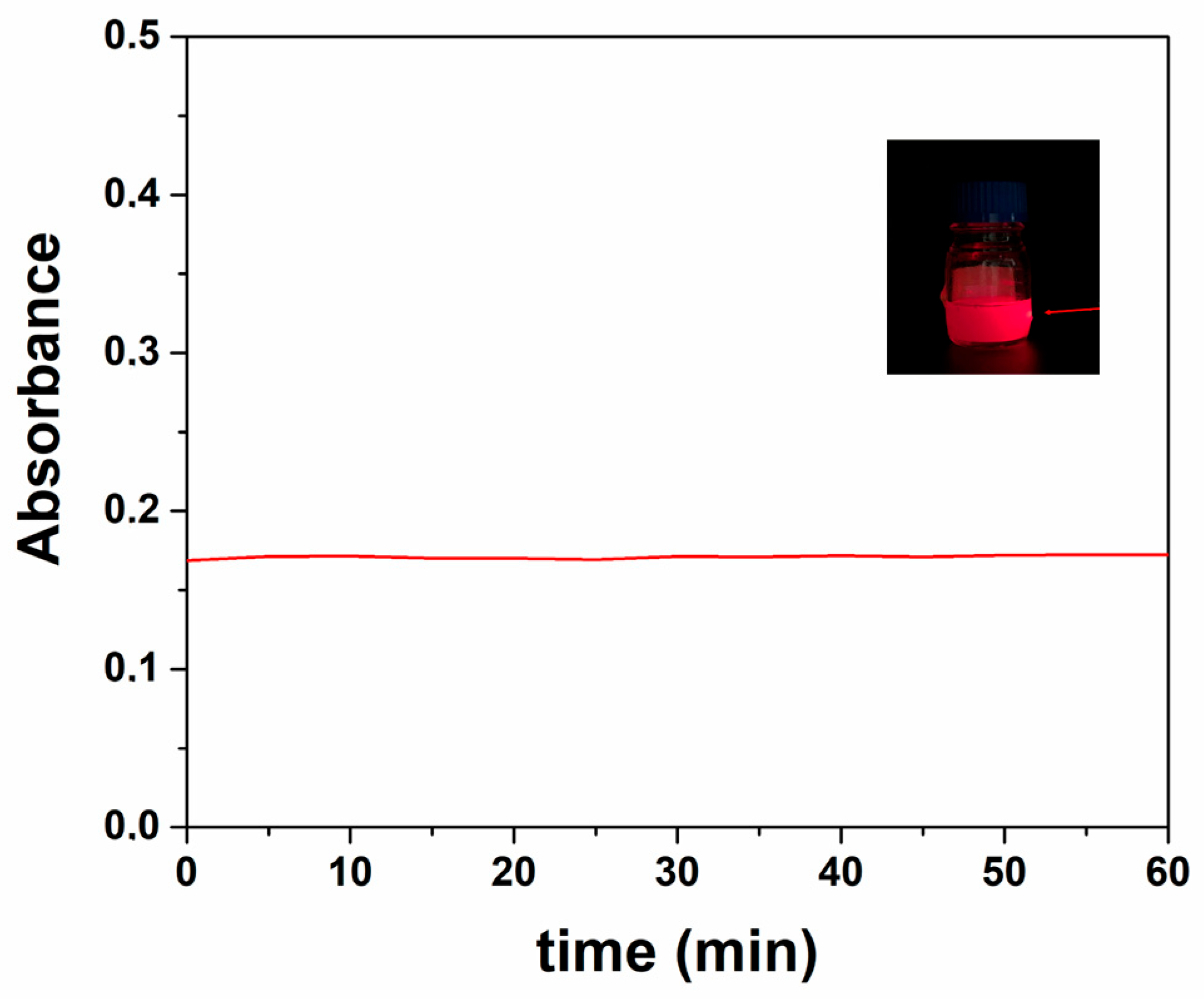 2. All dispersions showed good stability under the same conditions. The stability of the dispersions was first assessed qualitatively through visual observation over time, monitoring the appearance of turbidity or sedimentation. Under these conditions, the systems remained macroscopically stable for approximately one hour at room temperature, with the best performance observed for the 75:25 water/isopropanol mixture. Although qualitative, these observations were reproducible across multiple preparations, confirming the enhanced colloidal stability achieved under these solvent conditions. To further evaluate dispersion stability, turbidimetric measurements were carried out. The absorbance of the dispersions remained unchanged for 60 min, indicating stability within this time range. Moreover, after gentle agitation, the dispersions appeared homogeneous, and the Tyndall effect was clearly visible when illuminated with a red laser, further confirming their colloidal nature (inset in