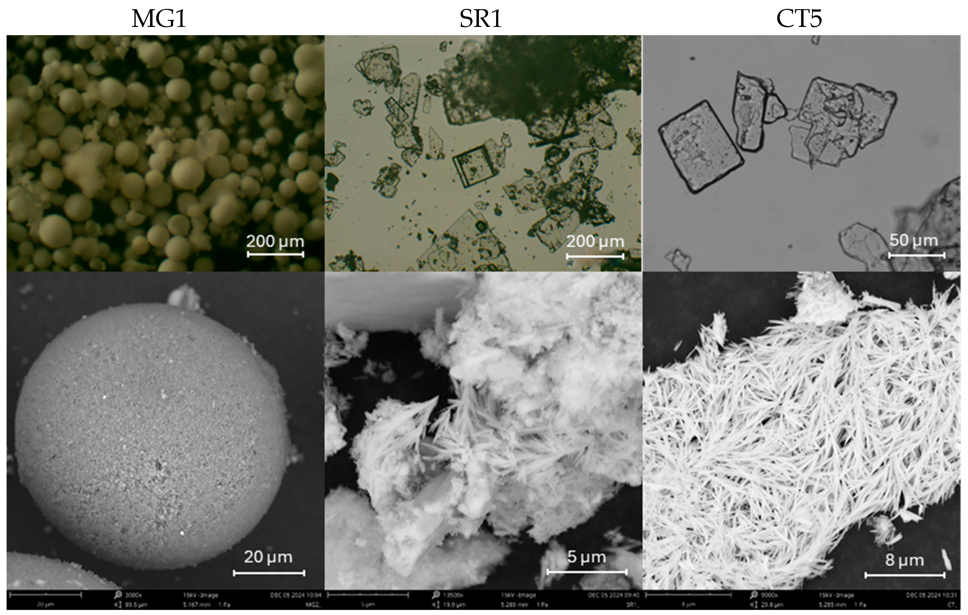 SEM observations confirmed the similarities found for the barium hydroxide (CT5) and strontium hydroxide (SR1) samples, which are characterized by a fibrous structure. A perfectly delineated spherical shape is observed for the magnesium hydroxide (MG1) samples, whose particle size distribution is reported in