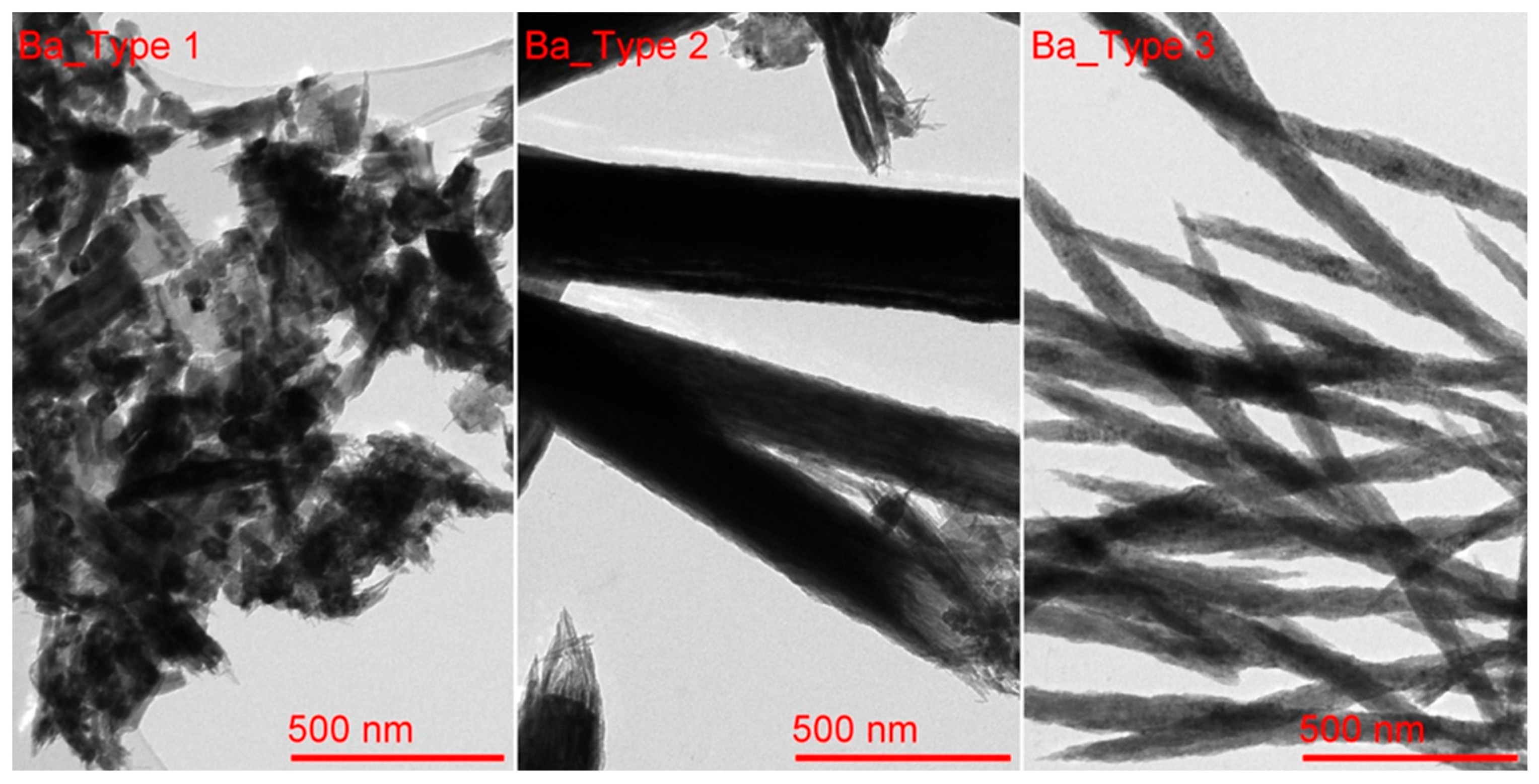 Table 2) supports the morphological distinctions among the three barium hydroxide particle types. Type 2 exhibits the highest average length (~163 nm) and area (~121 nm