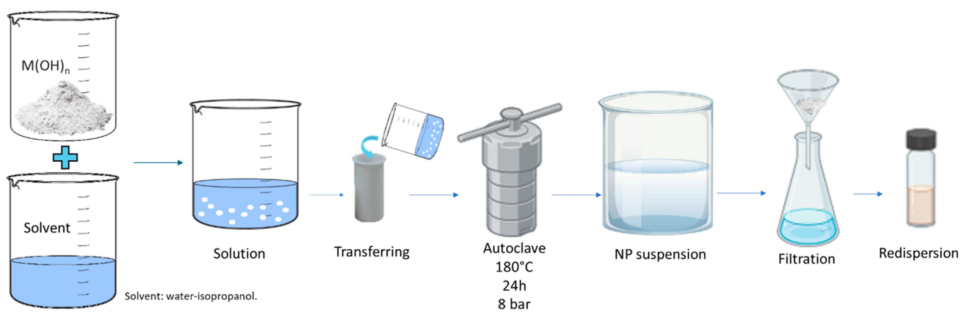 15], which enables the direct formation of crystalline phases in aqueous or mixed-solvent media under an elevated temperature and pressure. Hydrothermal or solvothermal treatments in autoclaves are particularly attractive due to their ability to generate high-purity, crystalline materials without intermediate calcination or sintering steps. Moreover, the use of green solvents such as water and short-chain alcohols (e.g., ethanol, isopropanol) reduces toxicity and improves particle dispersion in the final colloidal systems.