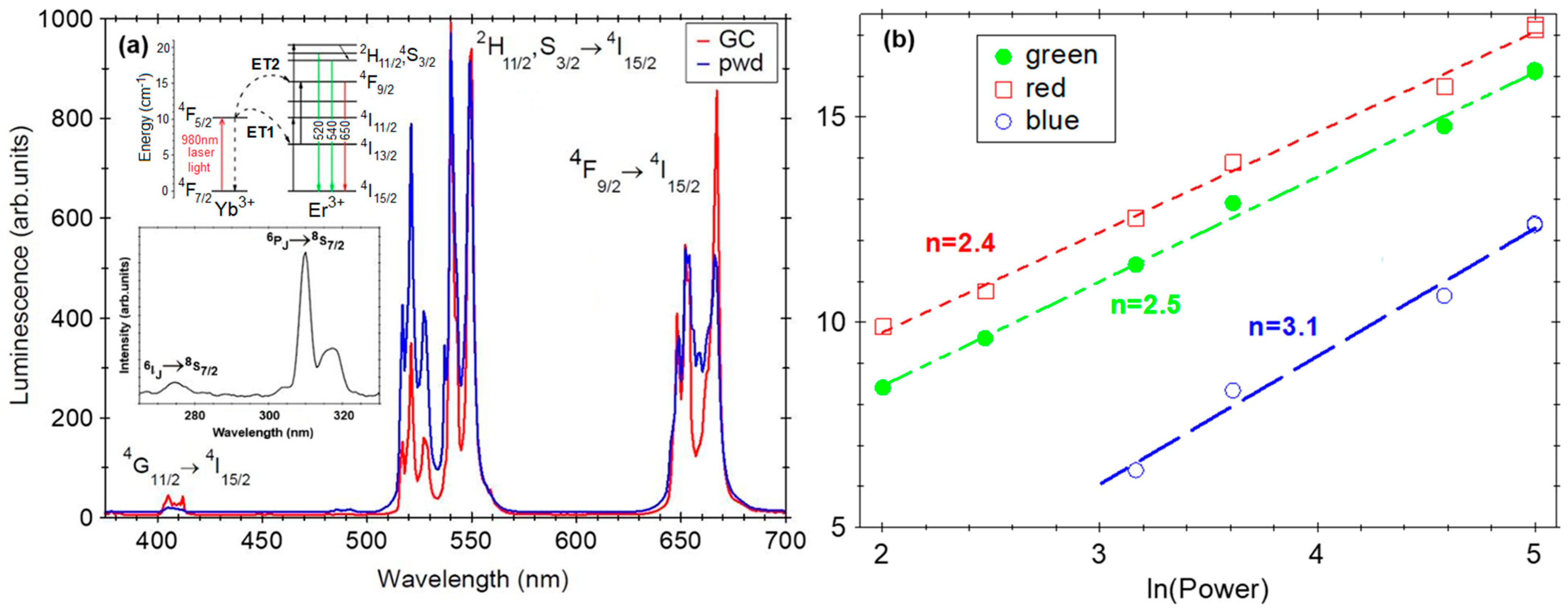 - Pollnau, M.; Gamelin, D.R.; Lüthi, S.R.; Güdel, H.U. Power dependence of upconversion luminescence in lanthanide and transition-metal-ion systems. Phys. Rev. B 2000, 61, 3337. [Google Scholar] [CrossRef]