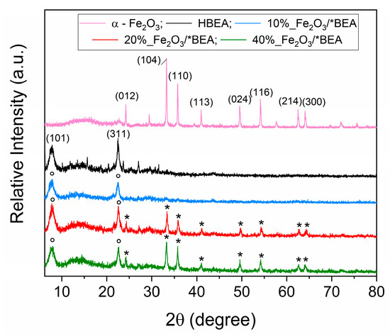 XRD of the catalysts, in which (*) indicates the peaks related to the crystal planes of α-Fe2O3 and (°) to the crystal planes of the HBEA zeolite.