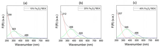 Experimental (black) and deconvoluted (colors) DRS/UV-Vis of: (a) 10% Fe2O3/*BEA, (b) 20% Fe2O3/*BEA, and (c) 40% Fe2O3/*BEA catalysts.