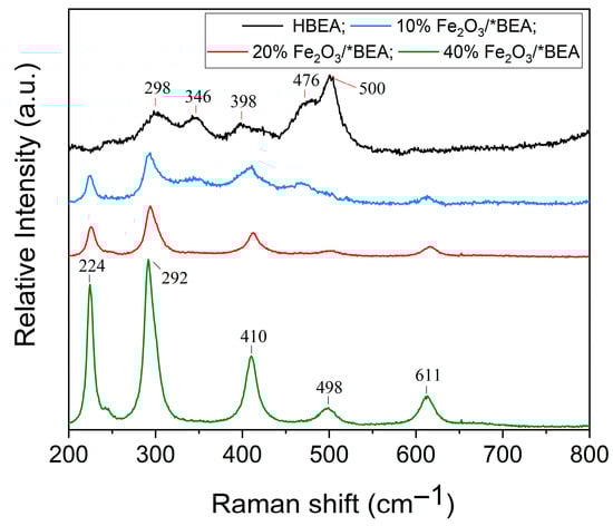 The spectrum of the 10% Fe2O3/*BEA catalyst closely resembles that of HBEA, although the typical α-Fe2O3 bands are still present. As the hematite loading increases (20 and 40 wt.%), the Fe2O3 bands become more clearly defined in the spectra. The more pronounced bands are also related to the intensity of Raman scattering, which is proportional to the number density and average interaction of the species present in the catalyst structure [65]. Furthermore, the broadening of the bands observed for the 10 wt.% catalyst, compared with those for the 20 and 40 wt.% catalysts, is attributed to the insertion of the rhombohedral phase of α-Fe2O3. The higher iron(III) oxide content promotes greater crystallinity and, consequently, a better resolution of its characteristic bands [53]. It is worth noting that some HBEA bands may overlap with the characteristic α-Fe2O3 bands in the catalyst spectra (regions of 292–298 cm−1, 398–410 cm−1, and 476–500 cm−1). These results are consistent with the FT-IR findings, which confirm the presence of α-Fe2O3 species in all synthesized catalysts.