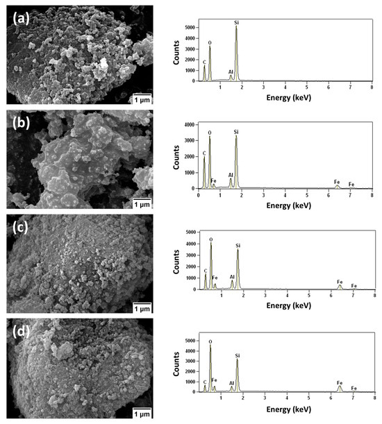 SEM micrographs of the HBEA support and the Fe2O3/*BEA catalysts are presented in Figure 5a–d and Figure S2, which also include the corresponding EDS spectra. The micrograph of the HBEA support (Figure 5a) shows clusters of morphologically uniform crystalline structures resembling rounded grains with surface roughness and an average particle size of approximately 60 nm. These features are consistent with SEM data reported in the literature for this type of zeolitic material [12,16,67,68,69]. EDS analysis confirms the presence of aluminum and oxygen, along with a dominant silicon signal that agrees with the Si/Al ratio of 12.5 characteristic of HBEA.