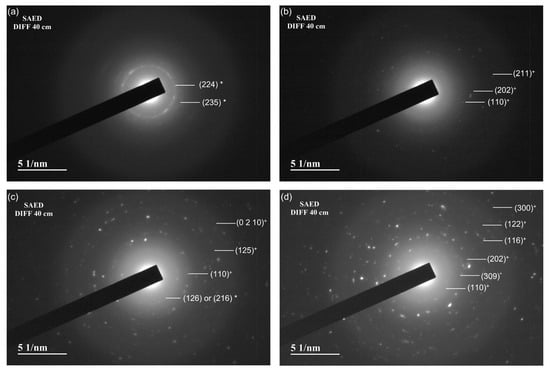 Selected Area Electron Diffraction (SAED) patterns (Figure 7a–d) were analyzed to complement TEM data, showing how Fe2O3 loading affects catalyst structure. The HBEA sample’s SAED pattern features low-intensity concentric rings matching the (224) and (235) planes of *BEA zeolite, according to IZA Database (BEA) of zeolite structures (Figure 7a). In the 10% Fe2O3/*BEA sample (Figure 7b), poorly defined rings indicate high dispersion of ultrafine hematite nanoparticles, with measured spacings aligning to α-Fe2O3 planes (211), (202), and (110) (COD ID hematite: 1546383), though their low intensity reflects small, partially disordered particles, a result consistent with XRD data. By contrast, the 20% and 40% Fe2O3/*BEA samples (Figure 7c,d) display sharper, brighter rings corresponding to both *BEA and α-Fe2O3 planes, indicating larger Fe2O3 crystallites as iron loading increases, in agreement with XRD (crystal sizes growing from 19 to 28 nm).