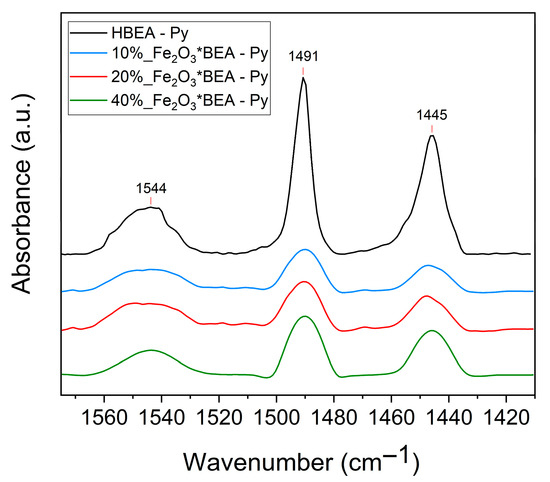 The FT-IR spectra of adsorbed pyridine show the bands at 1544 cm−1 (Brønsted sites); 1445 cm−1 (Lewis sites), and 1491 cm−1 (a combination of Brønsted and Lewis sites). No bands from the hydrogen bonding interaction-pyridine were observed. The observed bands are more intense as the quantity of impregnated iron(III) oxide increases on HBEA, but they are less intense than the parent HBEA. This is confirmed by the quantification of the total acid sites (Table 4).