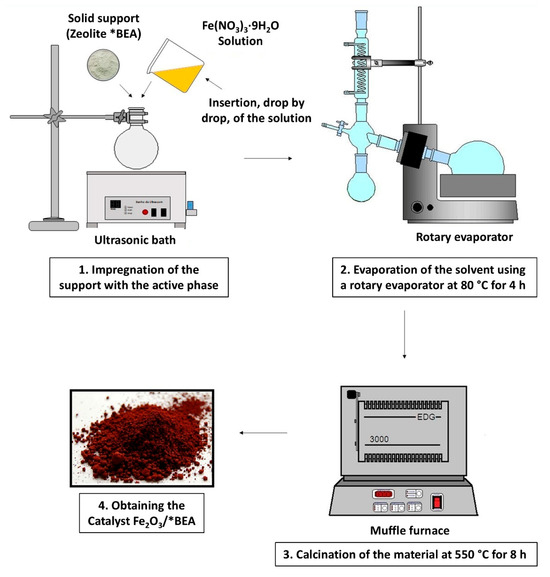 The synthesis of iron(III) oxide supported on *BEA zeolite was carried out using the incipient wetness impregnation method [36] applying the equation: V = Vp × m, where Vp is the total pore volume of the support (HBEA), m is the mass of the support to be impregnated, and V is the volume of precursor solution to be added. First, the ammoniacal *BEA zeolite was calcined at 550 °C for 8 h to obtain the zeolite in its protonic form (HBEA). For the synthesis of the 10 wt.% catalyst, for example, an appropriate mass (1.12 g) of the active phase precursor Fe(NO3)3·9H2O was dissolved in a predetermined volume of deionized water (2.0 mL), according to the required impregnation mass (2.0 g of HBEA). This volume was withdrawn using a pipette and added dropwise to the support (HBEA) in a round-bottom flask under ultrasonic agitation, with manual assistance using a spatula. The impregnated support was then placed in a rotary evaporator and subjected to controlled drying to remove the solvent. This procedure was carried out at 80 °C for 4 h. Then, each prepared catalyst was heat-treated in a muffle furnace under a static air atmosphere at 550 °C for 8 h (Figure 9). Catalysts were synthesized with iron(III) oxide loadings of 10, 20, and 40 wt.% (~1.12; 2.24, and 4.48 g of the iron(III) precursor).