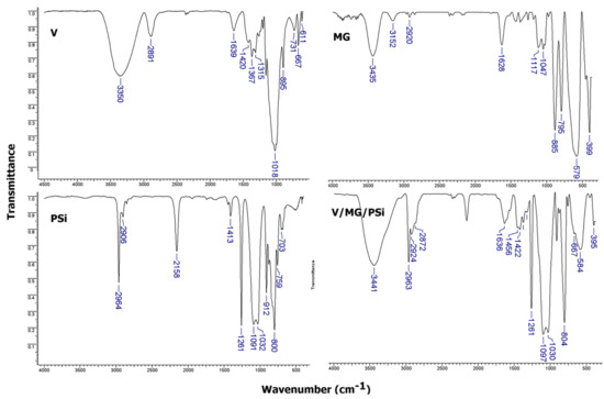 The structures of V, MG, PSi, and the V/MG/PSi composite were first assessed by infrared spectroscopy. Figure 1 illustrates the infrared spectra of pure V, MG, PSi, and V/MG/PPSi samples.