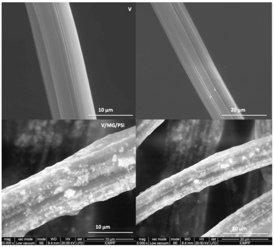 SEM was used to identify the supramolecular structures of the composite V/MG/PSi and compare them to those of pure viscose (V). The SEM images of V and V/MG/PSi are shown in Figure 2.