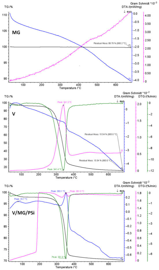 TG, DTG, and DTA curves for V, MG, and V/MG/PSi.