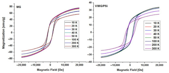 The variation in the magnetization of samples at different temperatures is due to surface effects arising from crystalline symmetries and antisymmetries, the existence of defects (voids), the reduced coordination of atoms at the surface of the ferromagnetic material, or a higher degree of interactions between particles. All of these can influence the electronic spin; thus, variations in magnetization occur [18]. The composite retains the ferromagnetic aspect of the magnetization curve. The saturation values of the magnetic moment for V/MG/PSi are 22 emu g−1 at 300 K and 33 emu g−1 at 10 K.
