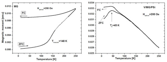 The temperature dependence of magnetization, measured with the zero field cooling (ZFC) and field cooling (FC) standards, is shown in Figure 6.