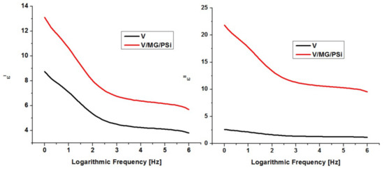 Variation in ε′ and ε″ as a function of frequency for V and V/MG/PSi.