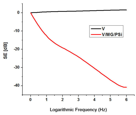 The shielding effectiveness was calculated with Formula (3) for the viscose (V) and textile composite (V/MG/PSi) samples. The samples were prepared in the form of felts (by pressing) and had a thickness of 3 mm.