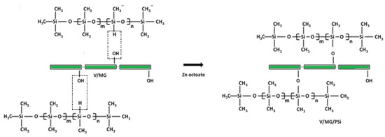 The hydrophobic Vs/MG/PSi composite was prepared by suspending 5 g of the Vs/MG composite in a 15 mL solution with a PSi concentration of 5% in toluene containing a Zn octoate catalyst (PSi/catalyst = 4/1 w/w). The reaction scheme is shown in Scheme 2. The mixture was heated at 60 °C for 24 h. Furthermore, the composite fibers were extracted from the solution and toluene was removed at 60 °C under vacuum. The 0.12 g/g content of polysiloxane attached to V/MG fibers was calculated using Equation (5):