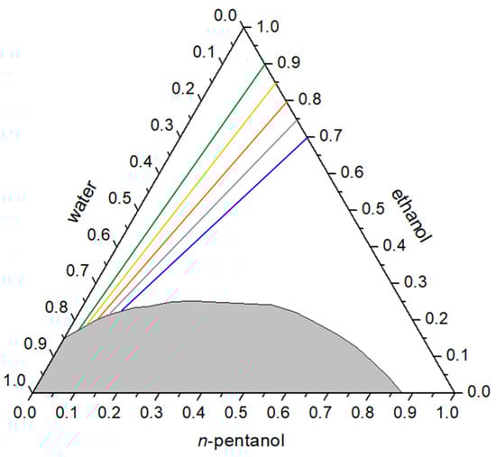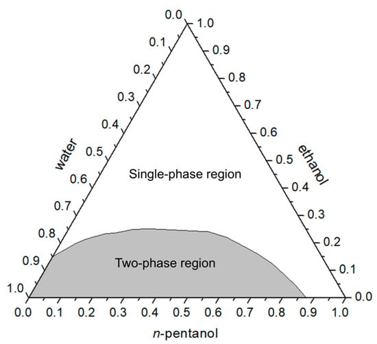 The broad extent of the single-phase region demonstrates that stable mixtures form across a wide composition range, including mixtures rich in both water and n-pentanol. This finding further confirms the role of ethanol as an amphiphilic mediator, while highlighting the decisive influence of the third component’s structure—the alkyl chain length—on overall miscibility.