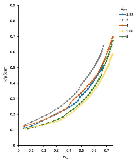 Electrical conductivity (κ) as a function of the mass fraction of water (ww) for the water/ethanol/n-pentanol system at a constant RE/P ratio.