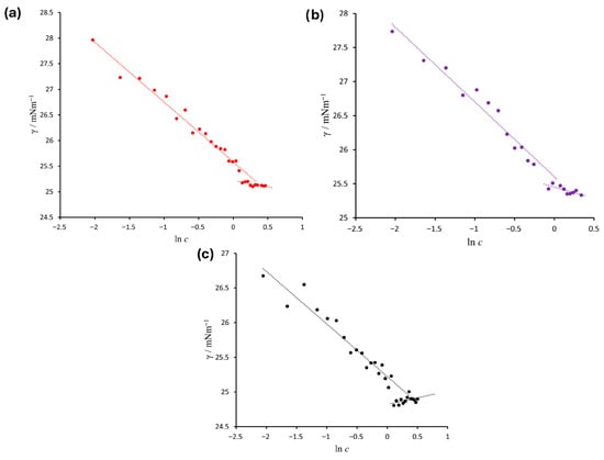 Surface tension was investigated in the water/ethanol/n-pentanol system along three different experimental paths, corresponding to initial water-to-ethanol ratios of 55:45, 50:50, and 45:55. In all cases, the concentration of n-pentanol was gradually increased within the single-phase region until the measured tension values stabilized—over multiple measurements—at approximately 25 mN m−1. The results are presented in Figure 4, showing a characteristic decrease in surface tension, which—after reaching a certain threshold—transitions into either a slight increase or a plateau.